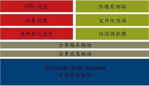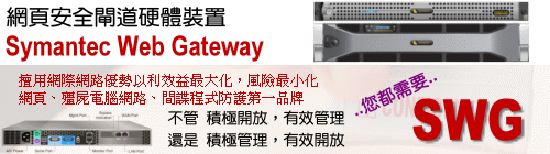 Web gateway)的金牌典範。Symantec Web Gateway 是一個創新的網路安全閘道硬體裝置,健全的核心安全防護,整合多種必要的安全技術,提供最完善的保護:1.網頁內容過濾(URL